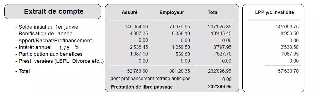 Exemple : Florian* va arrêter son activité à l'Hôpital du Valais au 31 décembre pour partir définitivement en France. Sa prestation de libre passage se monte à CHF 232'896.95. La partie obligatoire (min. LPP) qui se monte à CHF 157'633.70 sera bloquée en Suisse alors que le solde ( CHF 232'896.95 ./. CHF 157'633.70), soit CHF 75'263.25, lui sera versé.
